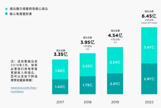 随着电竞项目由繁到简,从重度走向轻度,电竞项目受众不断扩大。从全球来看,2019年电子竞技总观看人数增长到4.54亿,同比增长15.0%;核心电竞爱好者的人数将达到2.01亿,同比增长16.3%,其中,中国核心电竞爱好者预计达到7500万。(数据来自Newzoo《2019全球电子竞技市场报告》)