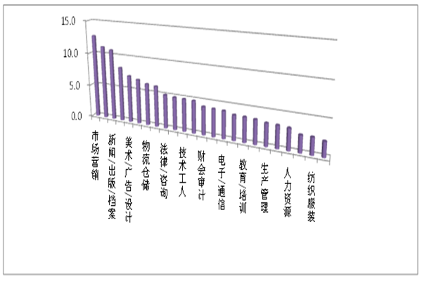 从市场需求来看,市场营销、机械制造、IT计算机、技术工人、电子通信等依然是当下用人需求量较大的热门职业。美术/广告/设计、建筑/工程/装修、生产管理等职位需求升幅明显。排名后几位的冷门职业需求是交通运输服务、法律/咨询、新闻/出版/档案、医疗服务、语言/翻译等。与2013年相比,岗位需求上升名次较多的是美术/广告/设计(11位)、生产管理(11位)、人力资源(7位)、人力资源(7位),岗位需求下降较多的是物流仓储(9位)、行政/文秘/后勤(5位)详见图表1、2。