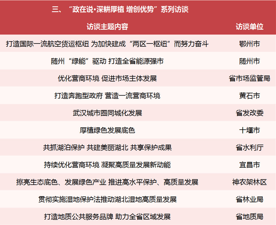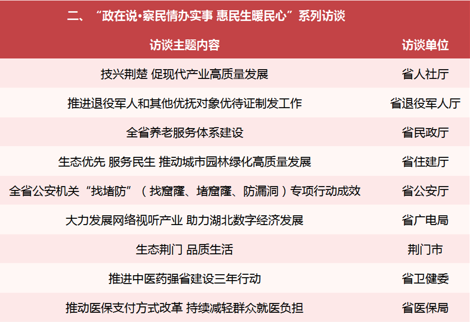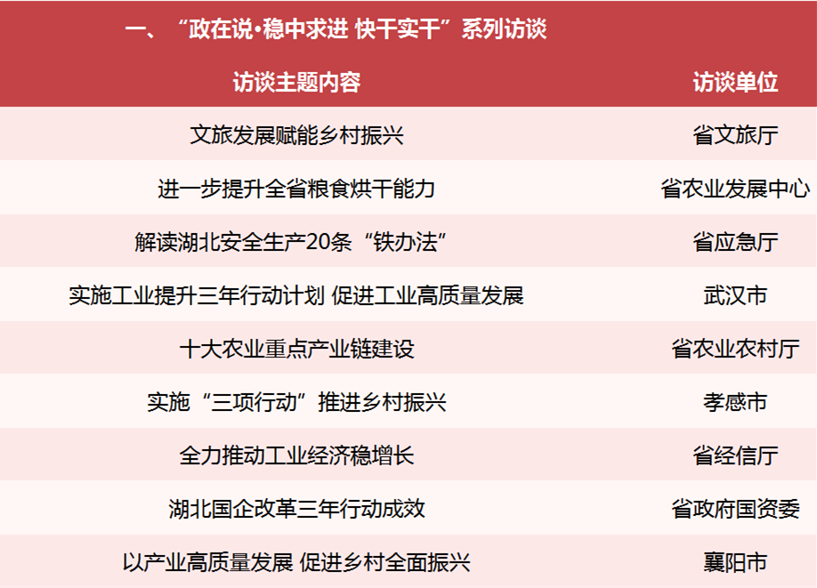 经省政府办公厅批准,今年在线访谈计划开展29场,涉及省文旅厅等19家省直部门、鄂州市等10个市(州)政府。访谈以“迎接党的二十大•锚定新发展 建设先行区”为主题,围绕“稳中求进 快干实干”、“察民情办实事 惠民生暖民心”、“ 深耕厚植 增创优势”三大内容展开。